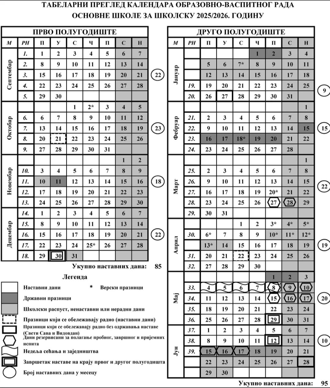 Годишњим планом рада предвиђено је да се у уторак, 12.11.2019. године настава одвија по распореду од понедељка, среду, 8.1.2020.године настава одвија по распореду од понедељка, и да се у четвртак, 30.4.2020. године настава одвија по распореду од понедељка.